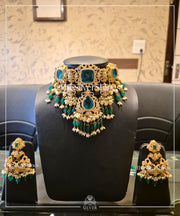 A striking heavy set featuring green semi-precious stones, beautifully complemented by Moissanite Polki accents. The necklace, with its bold design, showcases the rich green stones surrounded by the brilliance of Moissanite, while the matching earrings complete the luxurious look. Perfect for adding an opulent touch to any special occasion, this set blends traditional elegance with modern sparkle.
